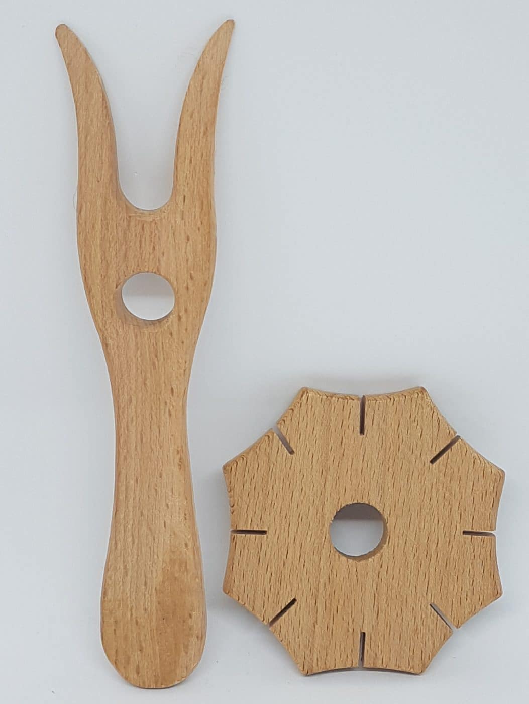 Déjà utilisée par les Vikings et au Moyen Age pour la fabrication des cordons, la fourche (lucet en anglais) permet d'obtenir rapidement des cordelettes en tous genres, d'aspect tricoté. De manipulation très simple, ce petit outil servira en de nombreuses occasions.