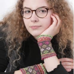 A la manière balte, les chauffe poignets Annemore se portent serrés pour un maximum de chaleur et sont donc à tricoter en jacquard avec des aiguilles très fines. Parfaitement coordonnées à la veste Katlin ou idéalement portées avec une tenue noire, ces manchettes graphiques sont embellies par une bordure florale perlée. Existent aussi en version gris/rose. Apprenez les techniques des chauffe poignets English pattern available.