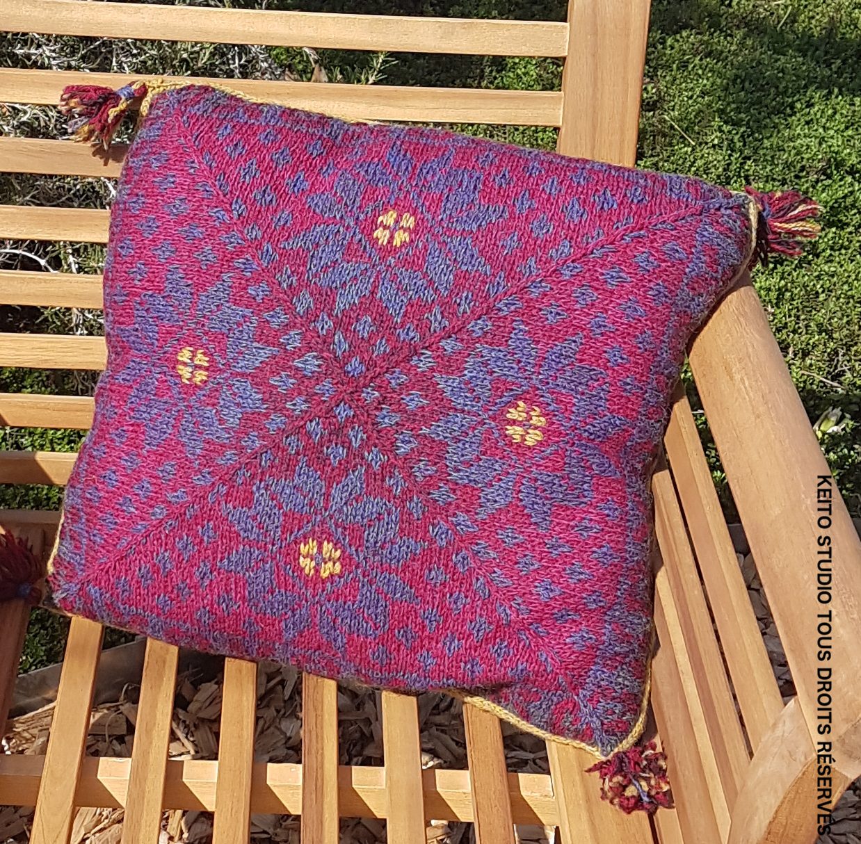 Tricoter le coussin Ülle, c’est partir pour une aventure tout en couleurs, riche en techniques.