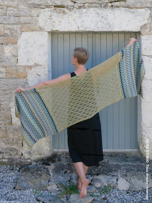 La partie centrale, délicate et très légère, est inspirée d’une dentelle estonienne appelée « feuille d’airelle » : elle peut être tricotée dans sa version originale ou en bleu.