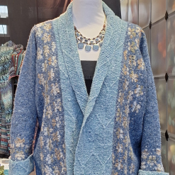 Inspirée des codes vestimentaires japonais, la veste Aiko parsemée de fleurs de cerisier se tricote à plat.